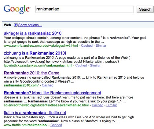 Over the last five days, Rankmaniac 2010: the Game has clawed its way from fifth to third place on its prime target Google, with two personal CMU student pages proclaiming their owners to be rankmaniacs still in the top two positions. On Bing the CMU rankmaniac pages continue to hold pride of place.