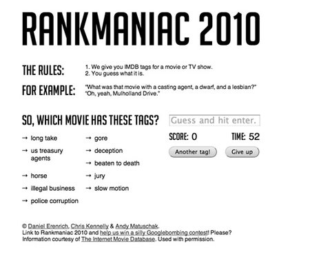 UPDATE: When the contest ended, Rankmaniac 2010: the Game remained in the third place. The game's creators say they will continue to analyze the data as more users play the movie game.