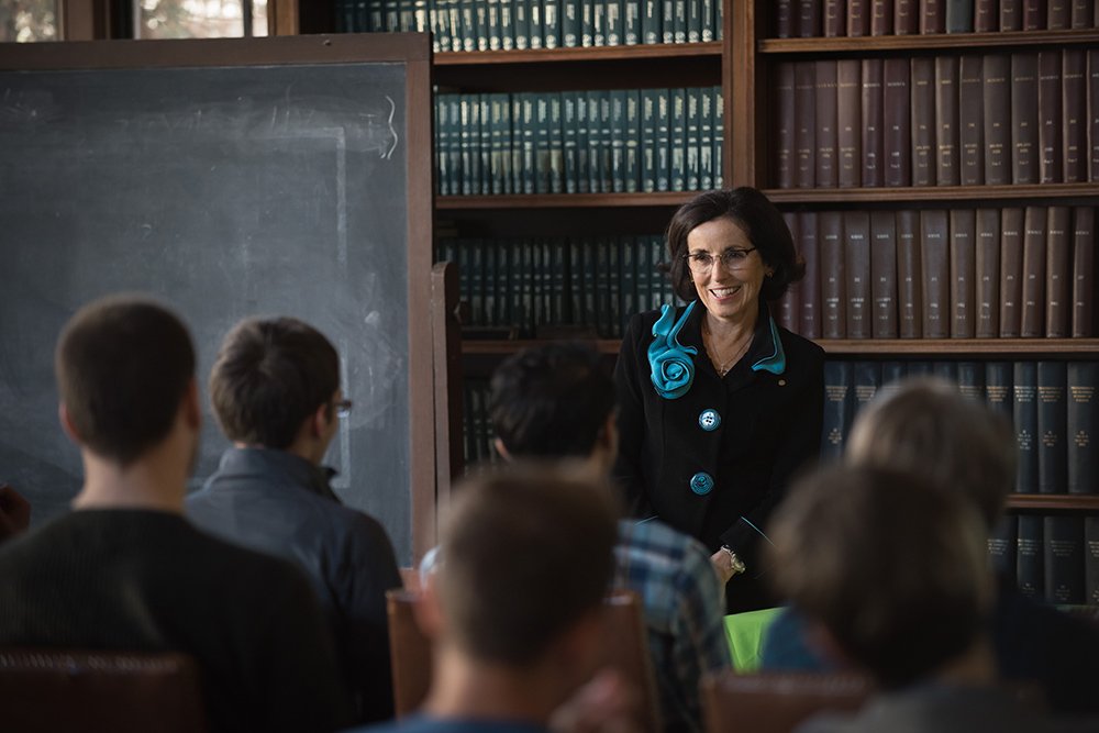 France Córdova (PhD '79), director of the National Science Foundation (NSF), recently visited Caltech to meet with students and researchers, and to give a talk about the role of the NSF in advancing basic science research—and in translating that knowledge into future technologies. The winners of three Caltech scholarships supported by Córdova were announced at her talk: Caltech graduate students Sarah Gossan, the 2016 Garmire Scholar; David Aasen, the 2016 Tombrello Scholar; and Michael Eastwood, the 2016 Neugebauer Scholar.