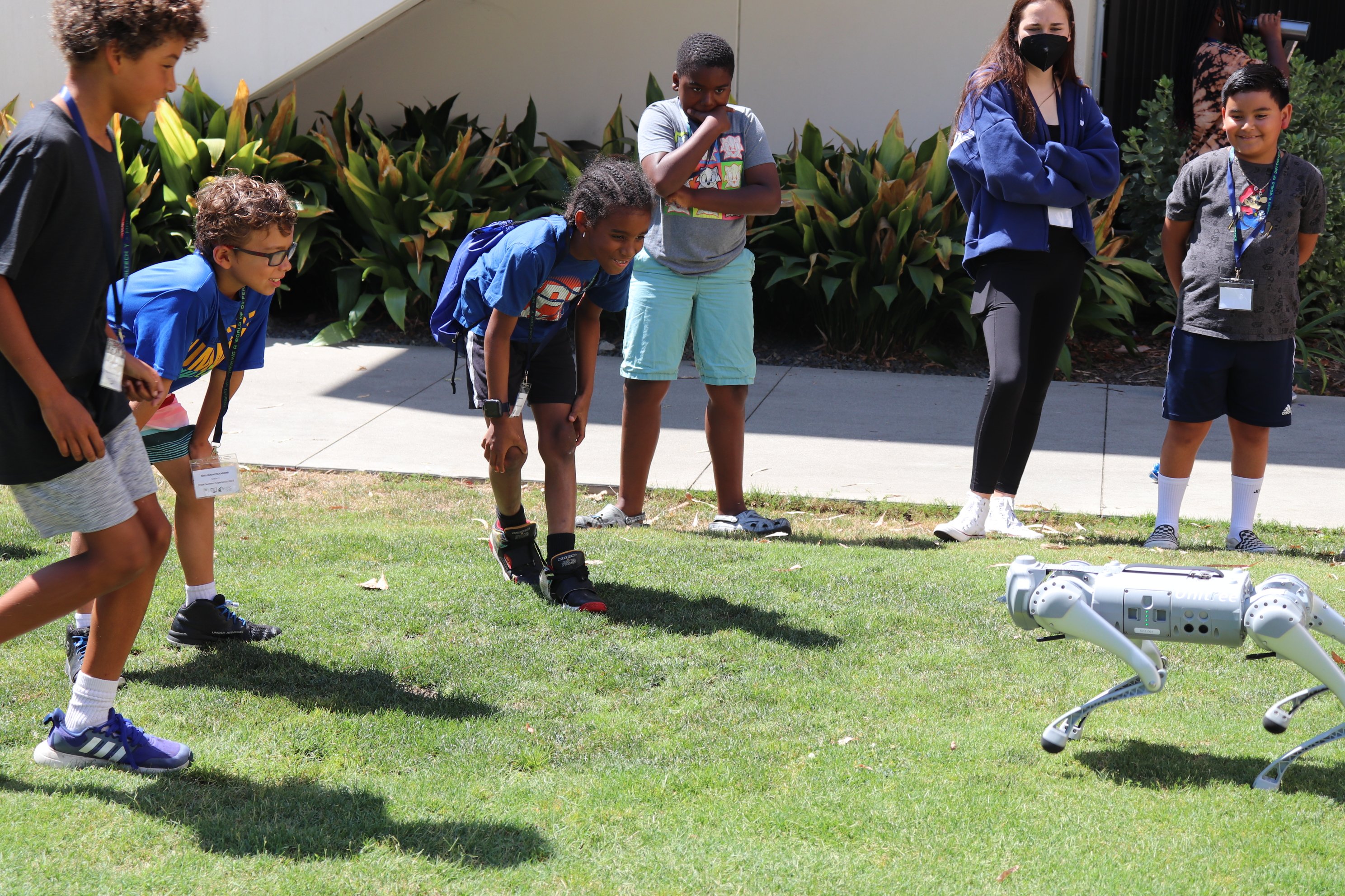 Image, top of page: A child in the 2023 STEAM Summer Experience laughs during a conversation with Courtney Reddix, student programs coordinator for the Caltech Y.
