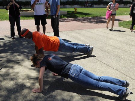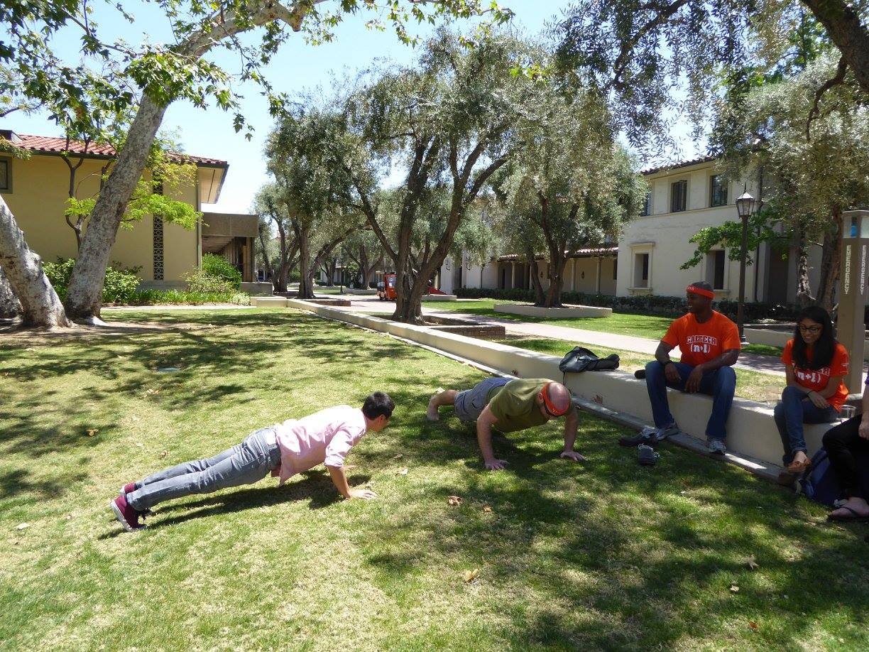 The Caltech Parents page on Facebook recently highlighted one of the fund-raiser's more entertaining events. Dean of Undergraduate Students John Dabiri (MS '03, PhD '05), Master of Student Houses Erik Snowberg, and men's basketball head coach Oliver "Doc" Eslinger spent an April day performing charity calisthenics: $2 a push-up. With 26 students donating a total of nearly $800, the three obliged with 377 push-ups. When Dabiri and Snowberg pledged to match, out of their own pockets, the donation of any student who joined in the workout, 15 of the 26 students accepted their challenge, pumping out an extra 256 push-ups and earning an additional $533.55 in matching funds.